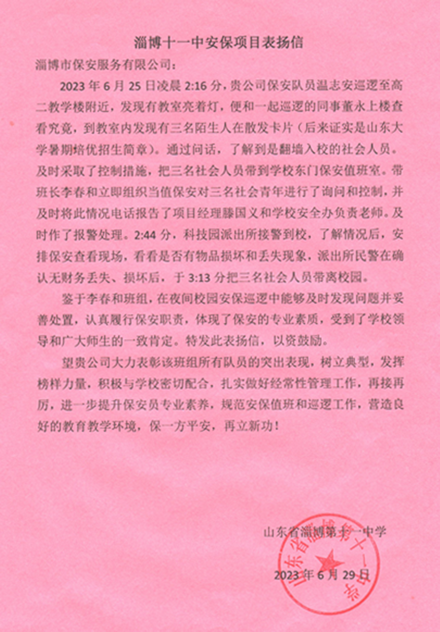 近日,淄博市校園安保抓到三名社會人員翻墻入校散發(fā)暑期培優(yōu)招生簡章,及時采取控制措施并報告校方安辦負(fù)責(zé)人,同時進(jìn)行報警處理。得到了校方的一致好評,并送上了表揚(yáng)信。